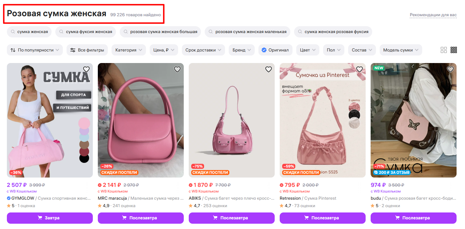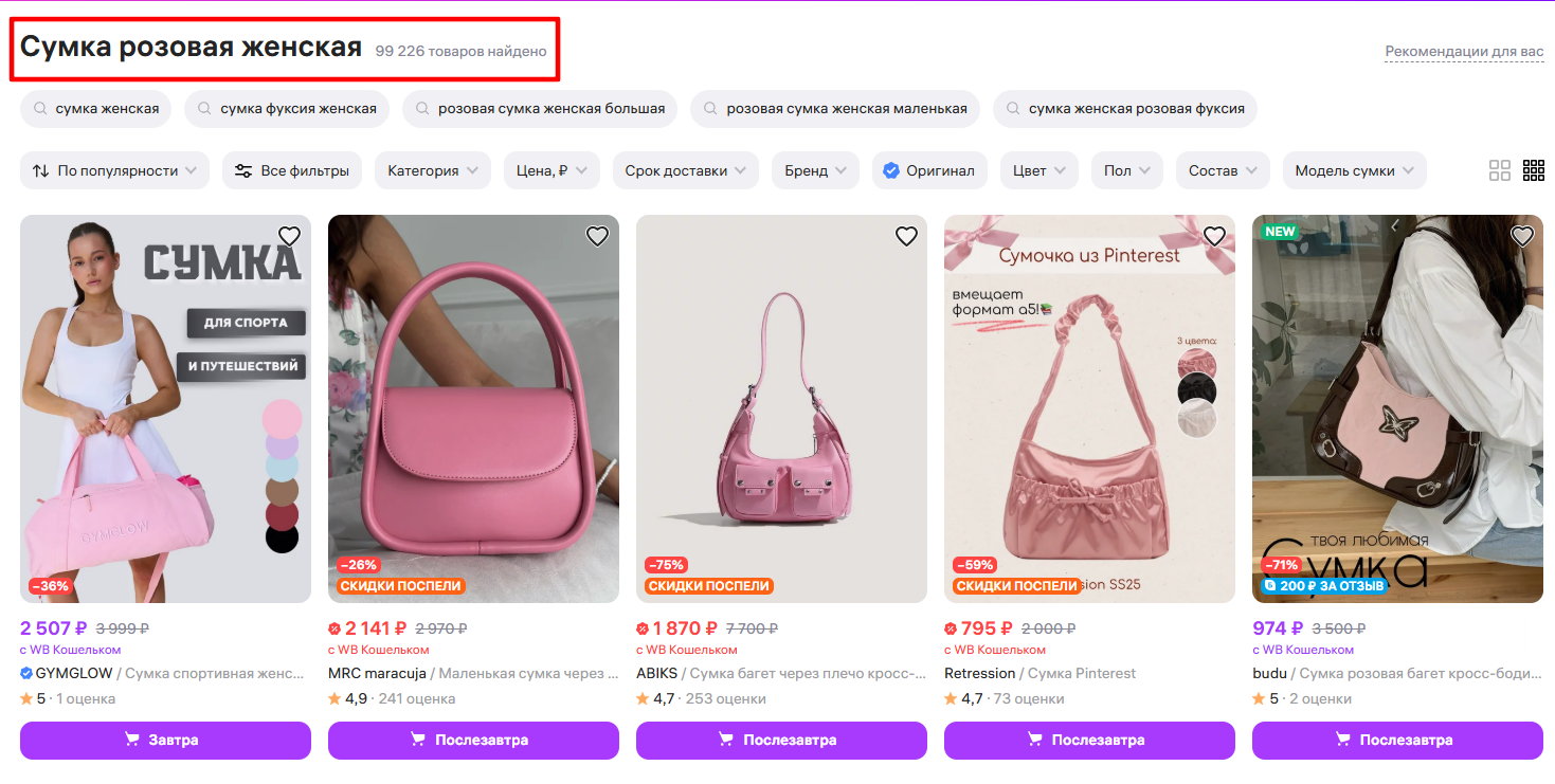 Например, попробуем выполнить поиск на WB по фразам "розовая сумка женская" и "сумка розовая женская".