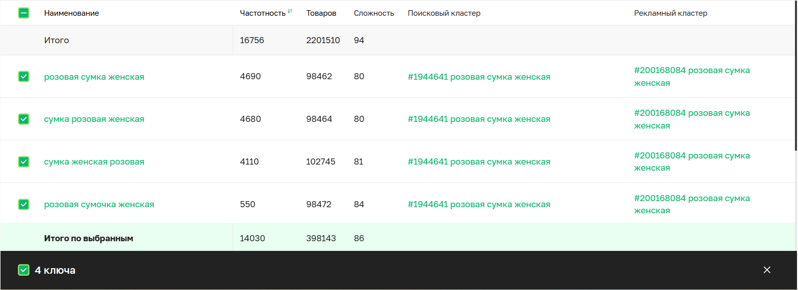 Рекламные кластеры - это группировка фраз на стороне WB, применяемая исключительно в рекламных кампаниях. У каждого рекламного кластера есть свой уникальный ID, присвоенный Wildberries. Наименование кластера - это фраза с наибольшей частотностью в данном кластере.