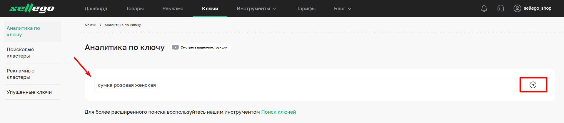 Перейдите в раздел “Ключи→Аналитика по ключу”, в поисковой строке введите интересующий запрос и выполните поиск.