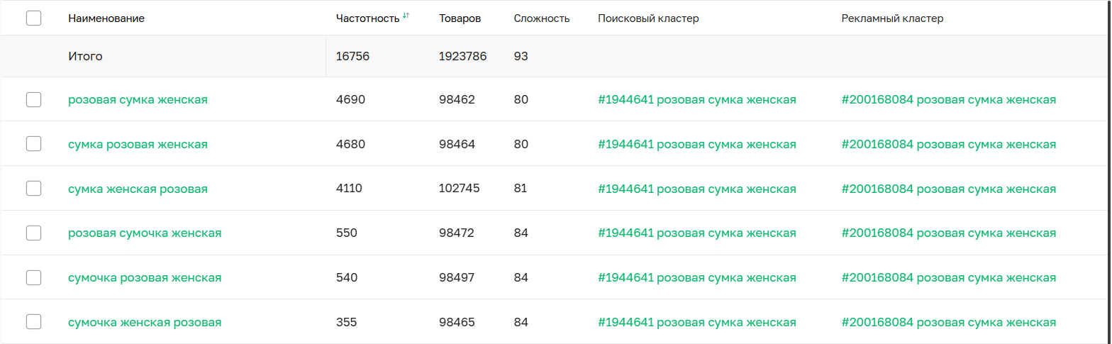 Помимо ID и наименования кластера, отображаем суммарную частотность по всем фразам, входящих на текущий момент в кластер и количество товаров.