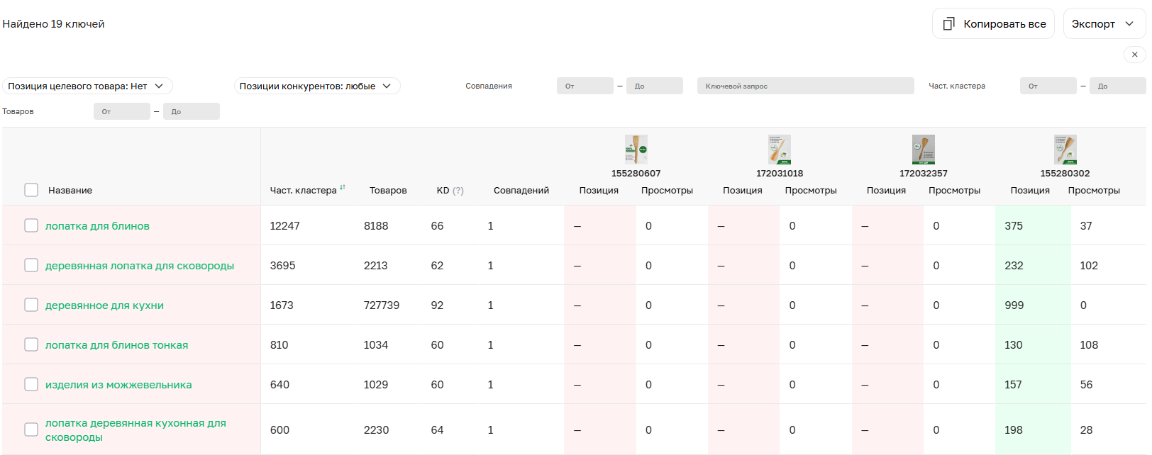 Фильтр позиций целевого товара предоставляет возможность посмотреть по каким ключам целевой товар ранжируется на выбранных позициях по сравнению с конкурентными артикулами.