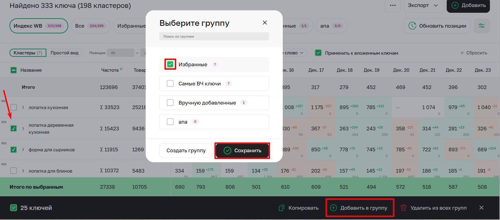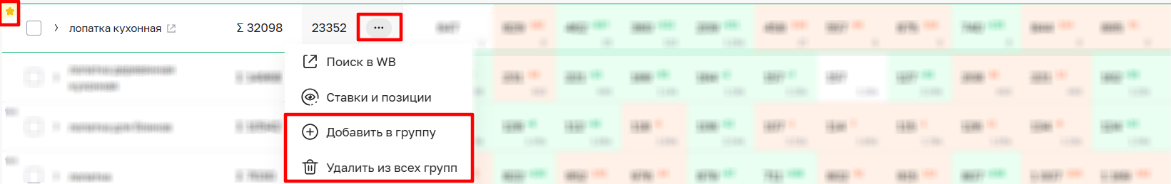 Чтобы быстро добавлять ключи в Избранное воспользуйтесь иконкой звездочки при наведении курсора на строку с ключом. Если вы хотите добавить конкретный ключ в группу используйте меню справа от ключа. Также через меню можно быстро удалить ключ из всех групп (кроме Индекса WB).