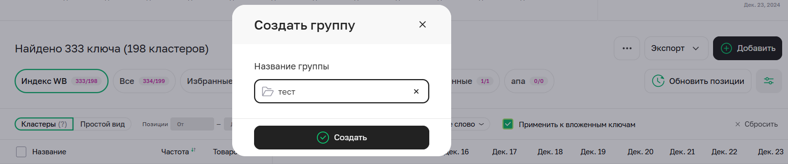 По каждому товару Sellego сам показывает все ключи из поиска Wildberries. Они отображаются в группе «Индекс WB», но вы можете добавить собственные ключи для ежедневного трекинга. Чтобы это сделать, нажмите кнопку «Добавить».