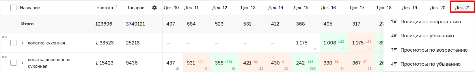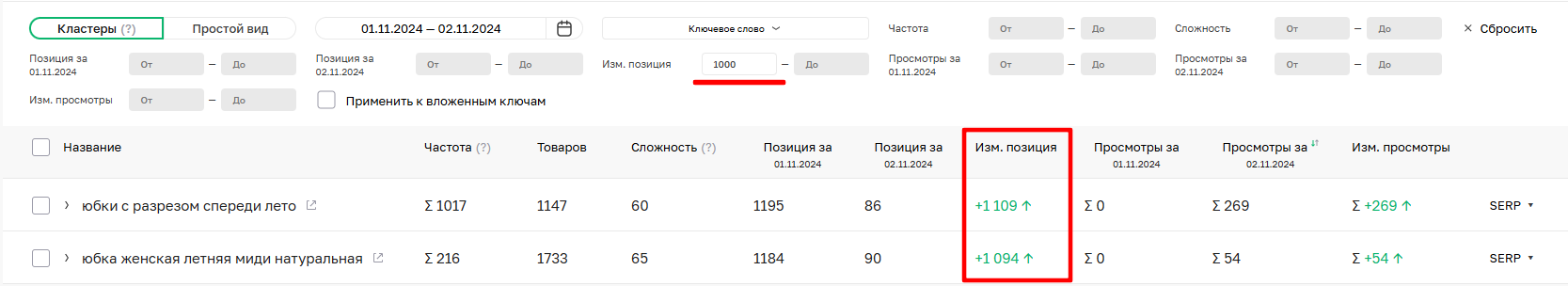 Дополнительно можете настроить фильтр так, чтобы были отражены только ключевые запросы с определенным количеством просмотров, по которым ваш товар занимает те или иные позиции за конкретную дату. Либо отразить только те запросы, где изменение позиций превысило, например, более 10 страниц.
