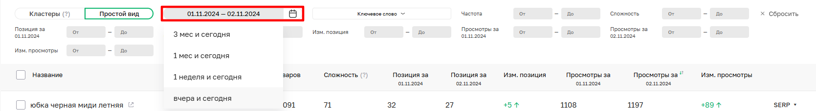 Инструмент “Сравнить даты” предоставляет возможность оперативно анализировать изменения в позициях и количестве просмотров по всем ключевым словам, сравнивая показатели текущей даты с предыдущим днем или другим заданным периодом.