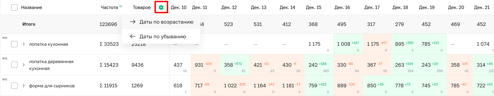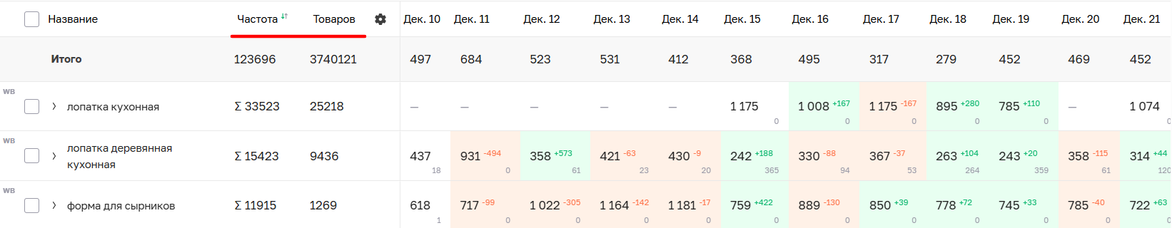 При нажатии на заголовки колонок ключи сортируются по возрастанию или убыванию частотности/товаров.
