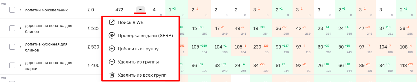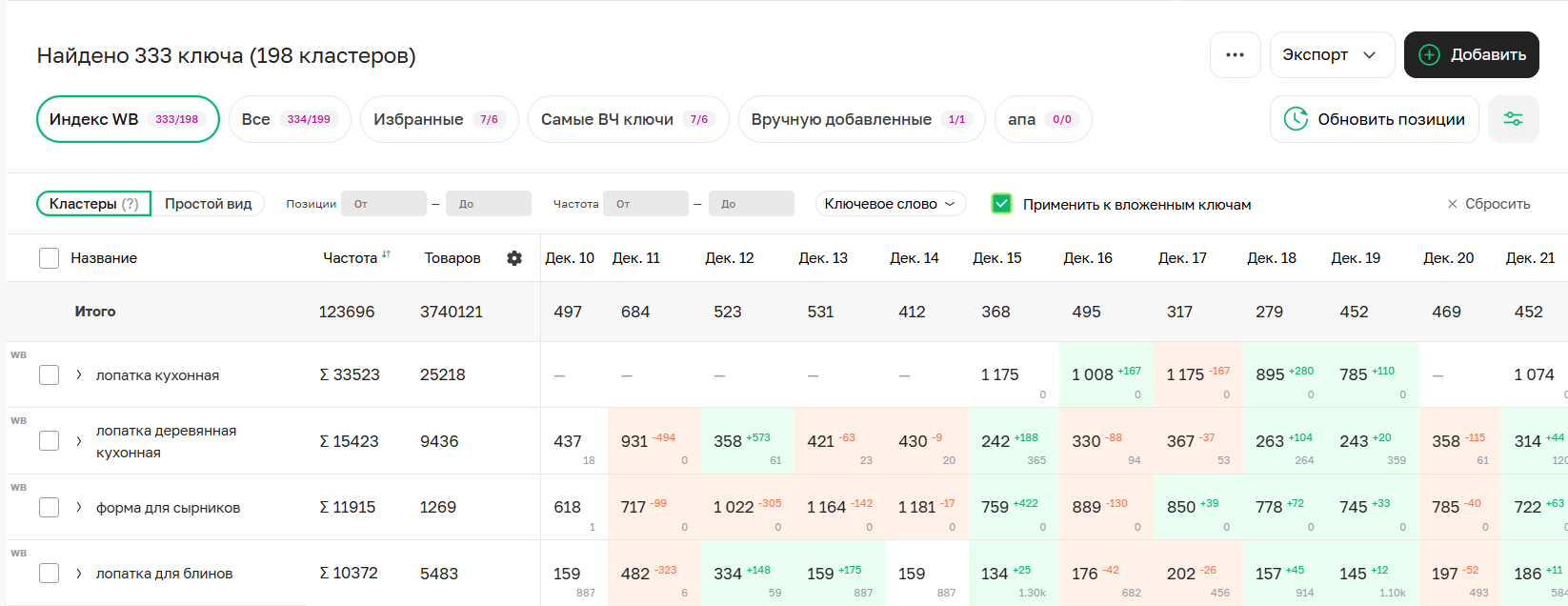 Предусмотрено отображение ключей с группировкой по кластерам. Поисковый кластер объединяет в себе фразы, у которых одинаковая выдача товаров на Wildberries. Такие фразы объединяем и отображаем в виде одной строки с просуммированной Частотностью.