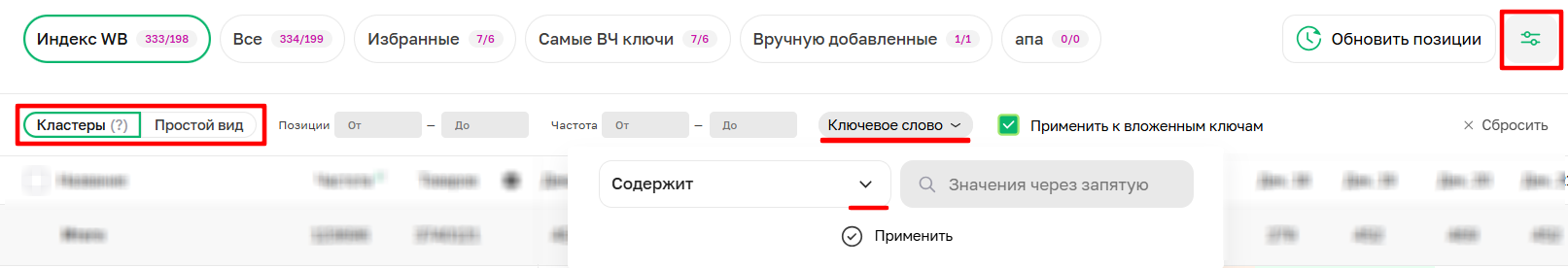 Чтобы открыть настройки фильтров нажмите на кнопку справа сверху таблицы. Вы можете настроить фильтр так, чтобы были отражены только ключевые запросы с заданной частотностью, по которым ваш товар занимает определенные позиции. Или отобразить только ключи, которые содержат нужное слово, фразу или их части.