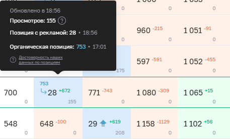Зона таблицы с позициями прокручивается горизонтально и показывает позиции и просмотры товара по ключу за каждый день. При наведении на ячейку появляется всплывающая подсказка с пояснениями значений и временем обновления данных.