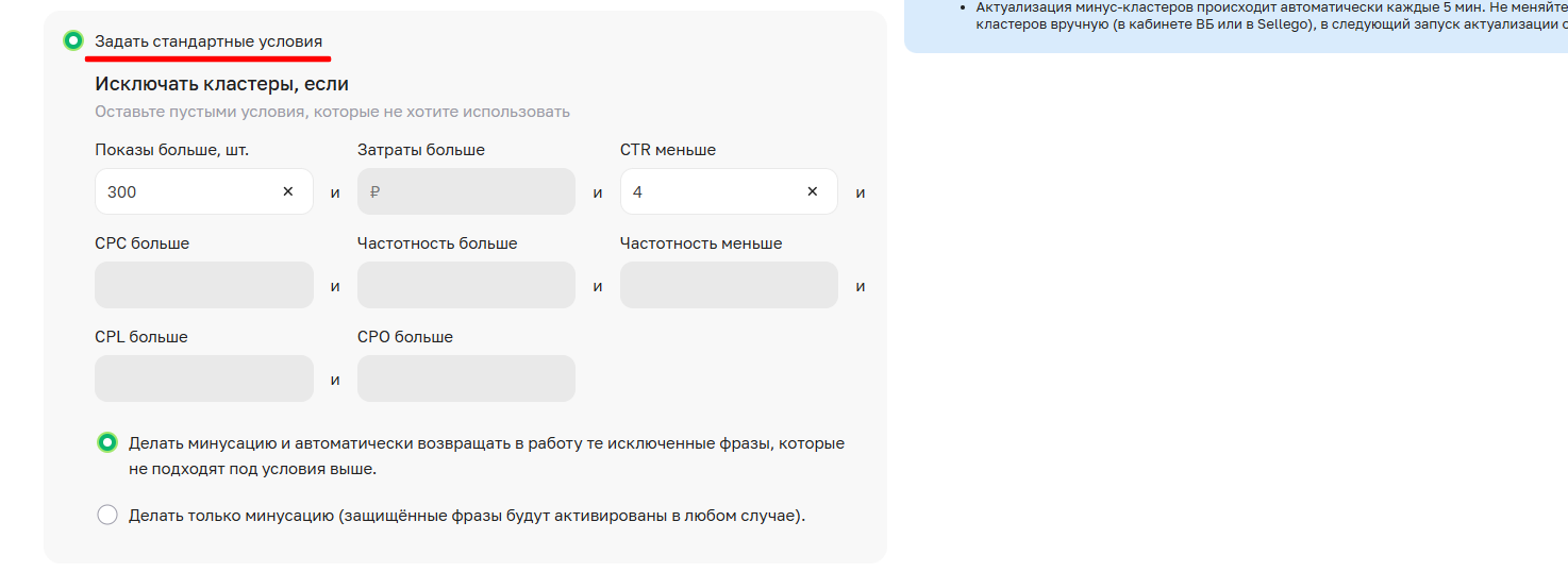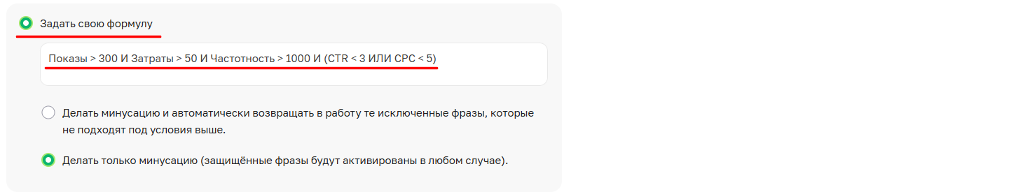 Стандартная формула: предполагает исключение кластера только при полном совпадении всех заданных вами критериев. Например, кластер будет исключен, только если одновременно выполняется условие по показам (например, больше 300) и условие по CTR (например, меньше 4%).