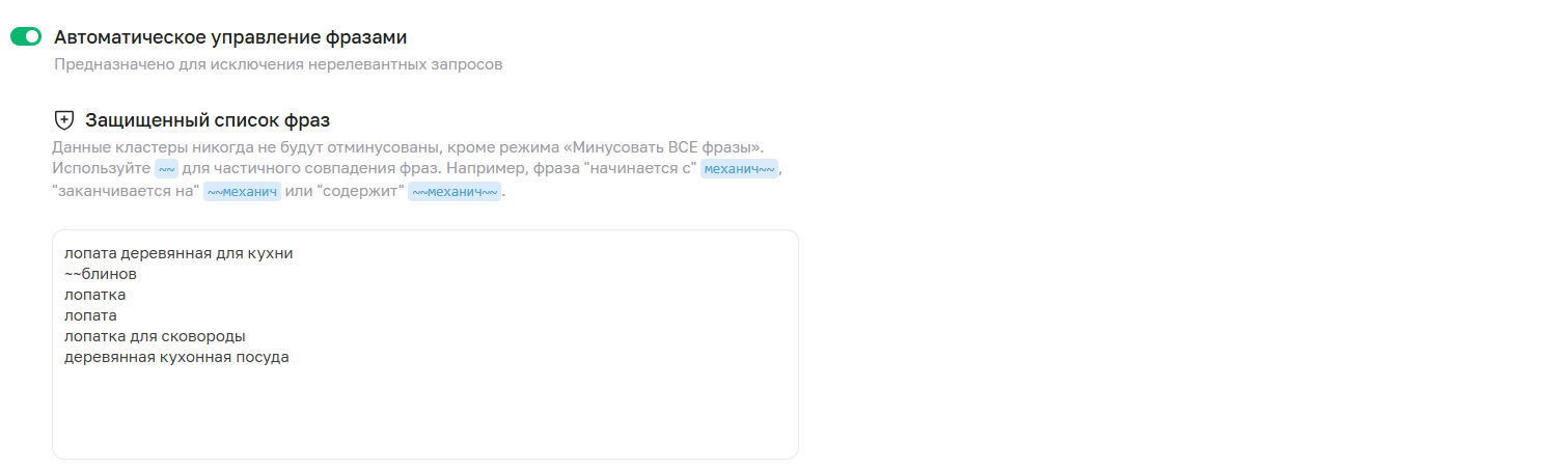 Защищенный список: содержит кластеры, которые всегда остаются активными и никогда не будут исключены, даже если их статистика не соответствует критериям минусации. Это важный инструмент для защиты ключевых, проверенных фраз.