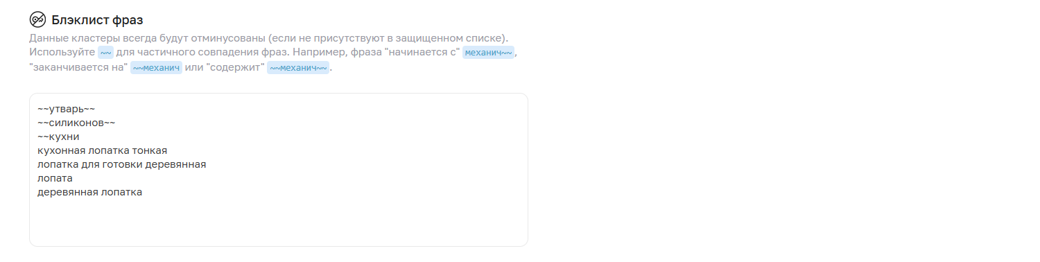 Блэклист: этот список, напротив, предназначен для фраз, которые всегда подлежат исключению. Их статистика не анализируется, и они никогда не будут участвовать в проверках автоминусации. Блэклист идеально подходит для полного игнорирования заведомо нерелевантных запросов, на которые вы точно не хотите тратить бюджет своей кампании.