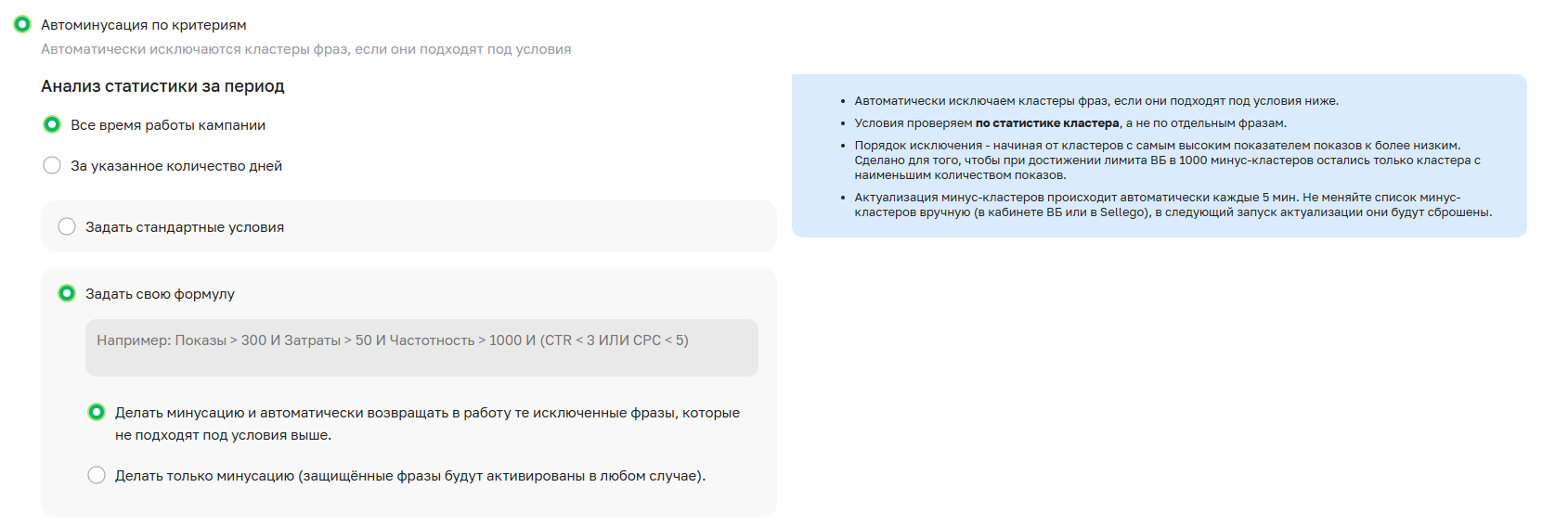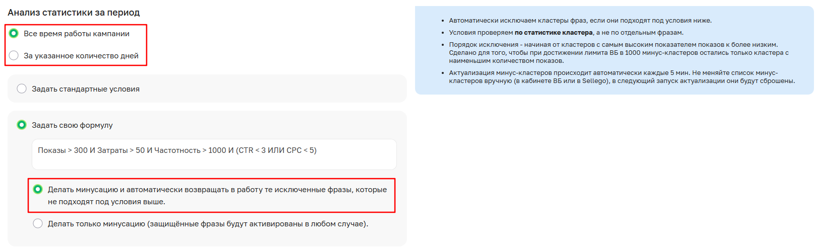 Проверка остальных кластеров: все остальные активные кластеры анализируются согласно выбранному периоду статистики ("За все время работы" или "За N дней") и примененной формуле минусации. Если условия выполняются, кластер только исключается.