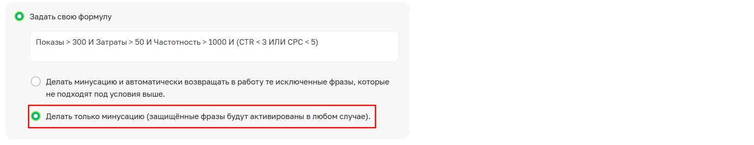 В режиме "Делать только минусацию" доступно ручное исключение активных кластеров, которые не подходят под критерии минусации. Если вы вручную исключили такой кластер, контроль органики для него не будет работать, даже если он удовлетворяет всем условиям для возврата