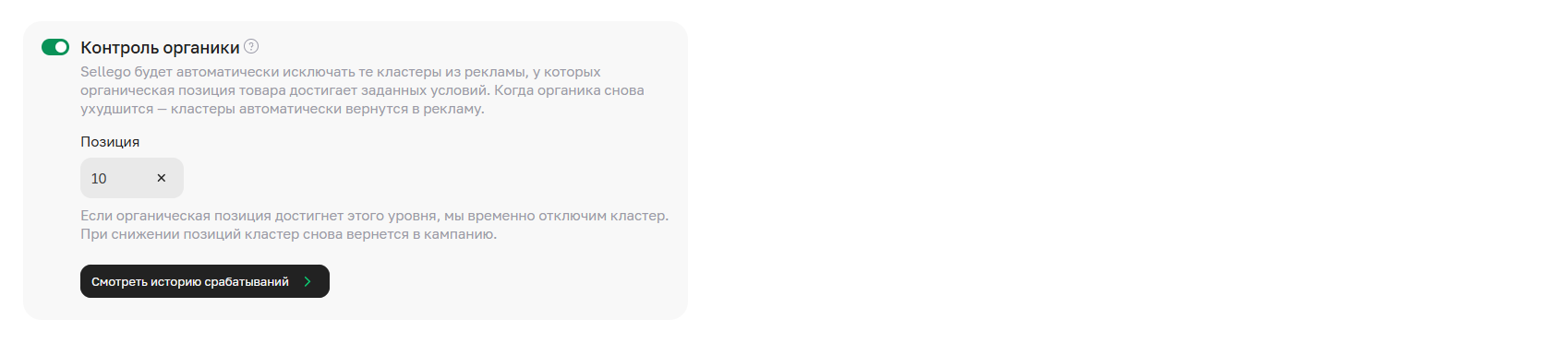 Контроль органики – функция автоматического автоуправления кластерами, которая анализирует их положение в органической выдаче. Она позволяет сэкономить рекламный бюджет, останавливая показы по кластерам, которые благодаря своим естественным позициям уже обеспечивают нужный охват без дополнительных затрат.