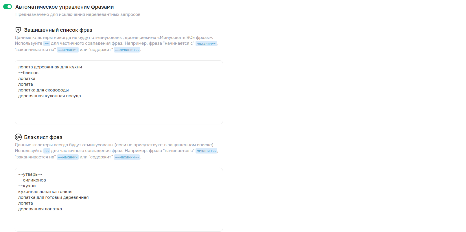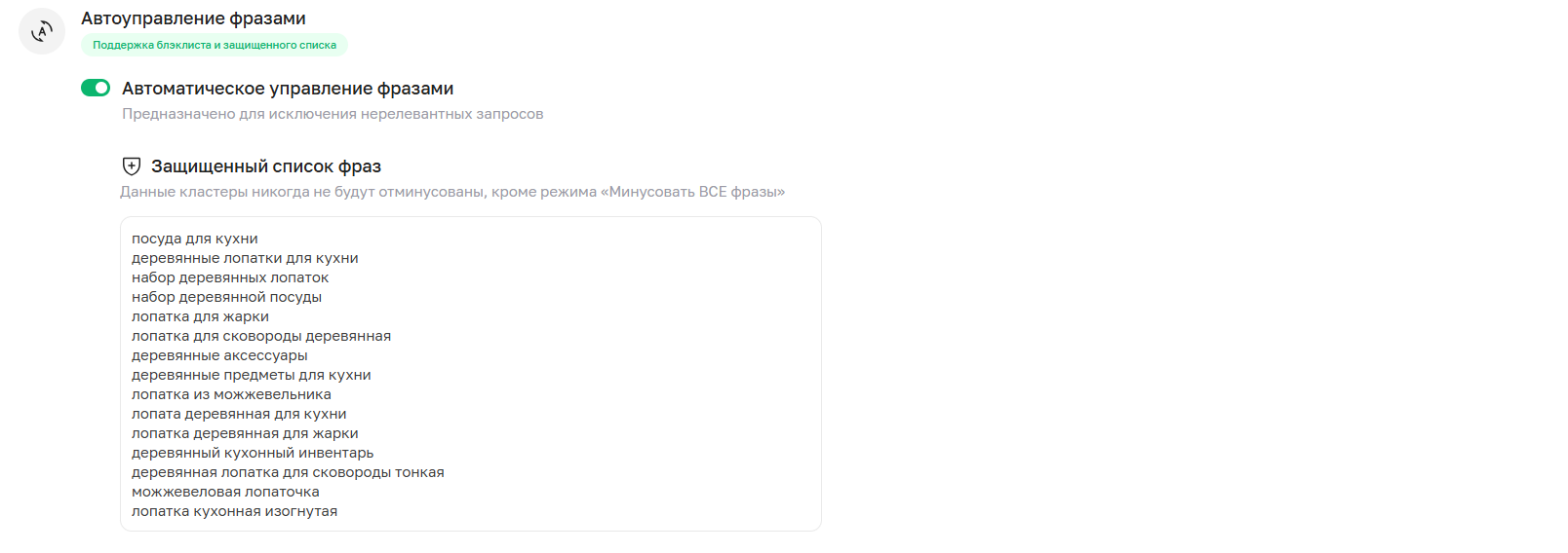 Этот режим автоматизирует процесс исключения кластеров на основе их статистики, позволяя поддерживать работу наиболее эффективных фраз.