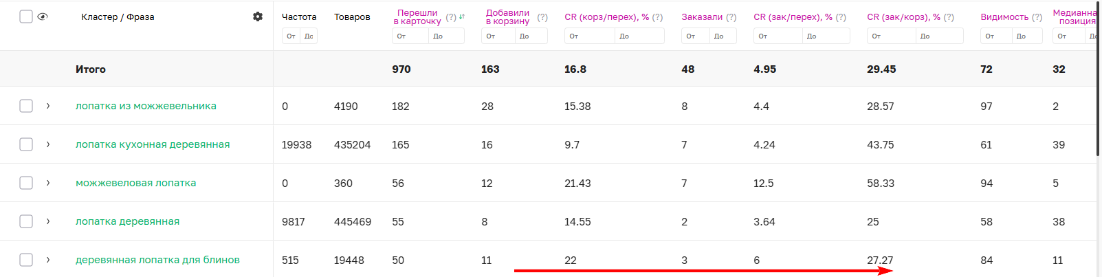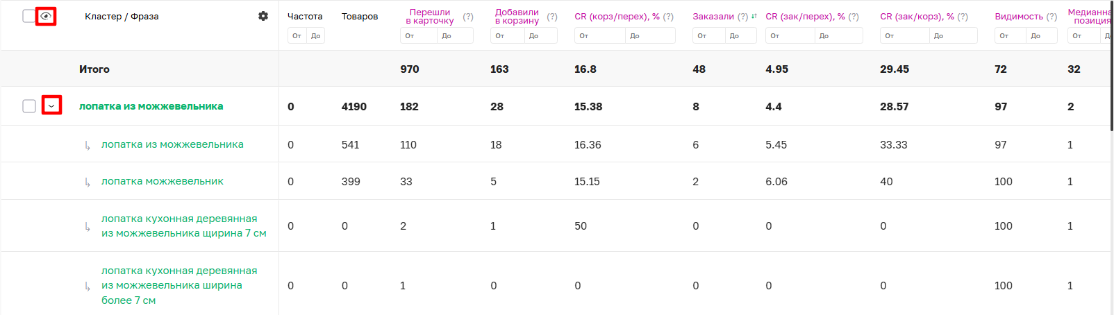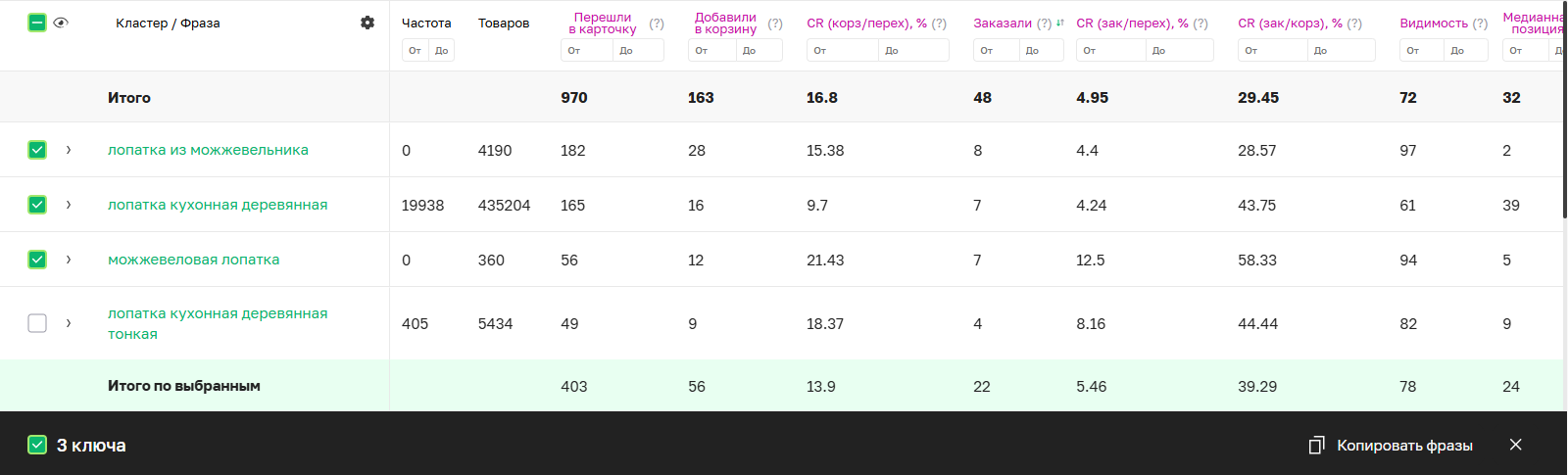 После анализа данных по артикулу можно вернуться в кампанию на страницу Ключи и кластеры для оценки эффективности фраз в конкретной рекламной кампании.
