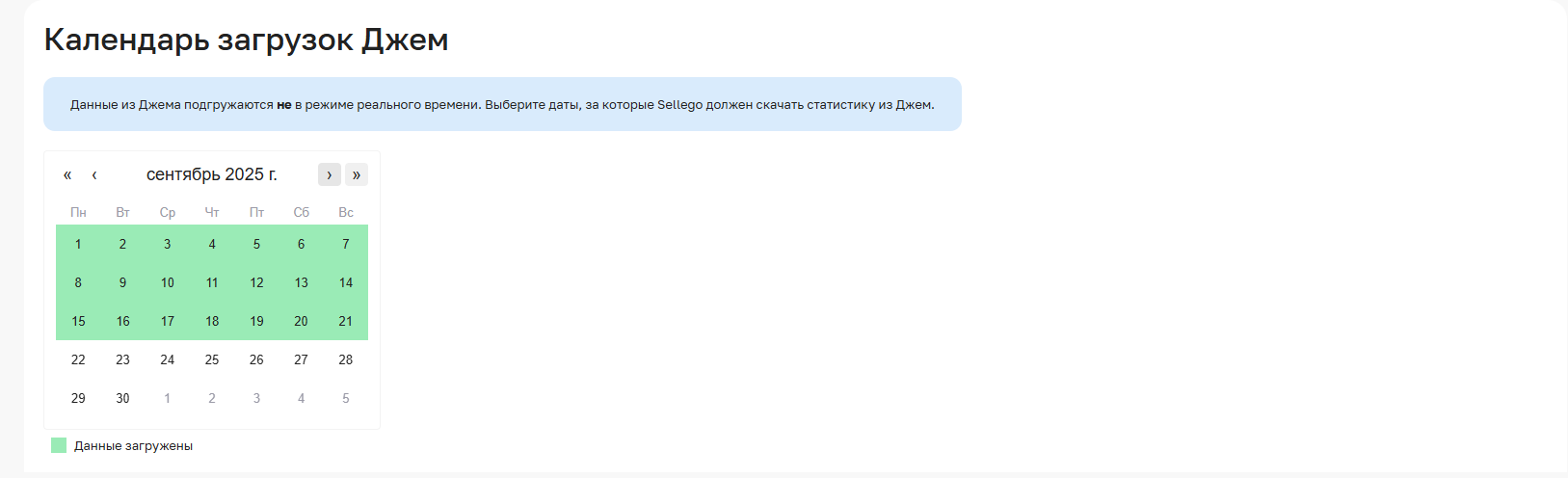 Ниже расположен календарь загрузок — интервалы, выделенные зелёным цветом, означают, что данные за эти даты уже загружены. Чтобы загрузить новые данные, выберите нужный диапазон дат и подтвердите загрузку. После этого задание начнет выполняться, а под календарем будет отображаться общий прогресс загрузки.