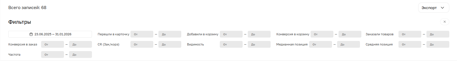 С помощью фильтров можно отсортировать кластеры по этим метрикам или упорядочить их по убыванию любого показателя, кликнув на название соответствующей колонки. Период для анализа выбирается через календарь, а данные можно выгрузить в файл через кнопку “Экспорт”.