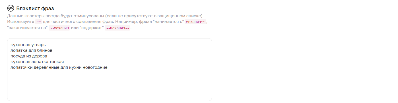 Фразы в Блэклиста будут игнорироваться. В любом случае все кластеры, кроме списка Защищенных, будут исключены.