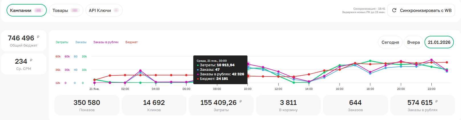 Под графиком в нижних блоках показывается итоговое количество показов, кликов, затрат, добавлений в корзину и заказов за выбранную в календаре дату. Слева расположены блоки, в которых фиксируются текущий остаток бюджета по всем кампаниям и средняя ставка (СРМ — стоимость за 1000 показов), обновляющиеся в реальном времени.