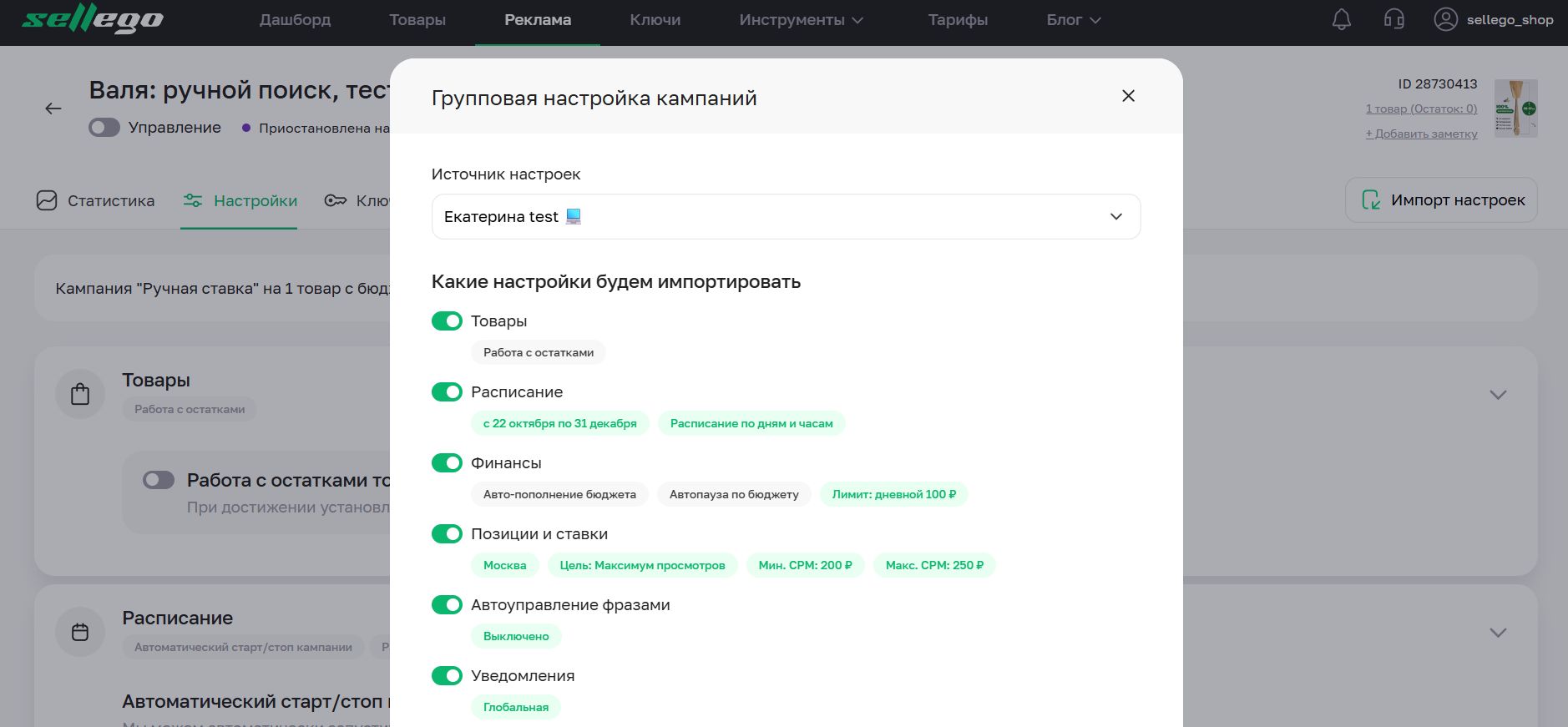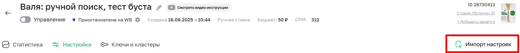«Импорт настроек» упрощает процесс настройки рекламных кампаний, давая возможность быстро копировать необходимые параметры из одной кампании в другую. Настройки можно применить двумя способами.