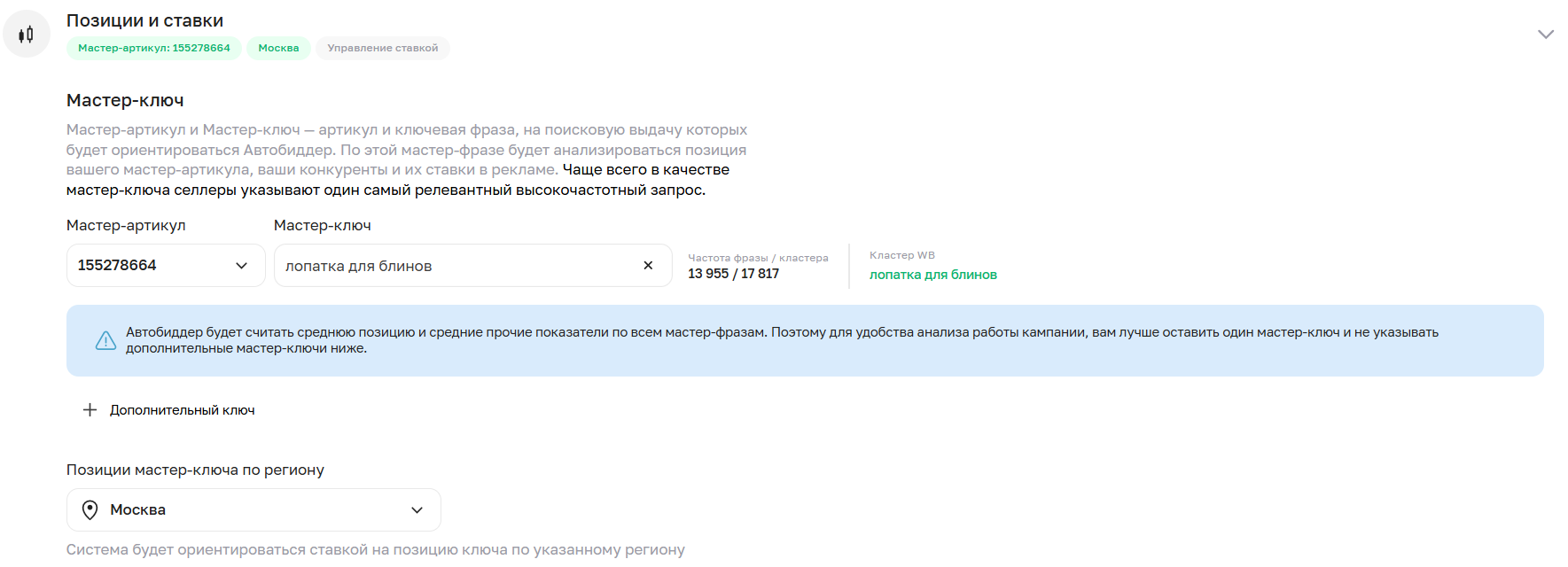На мастер-ключ биддер будет ориентироваться для выполнения стратегии и анализировать позицию вашего мастер-артикула в выбранном регионе.