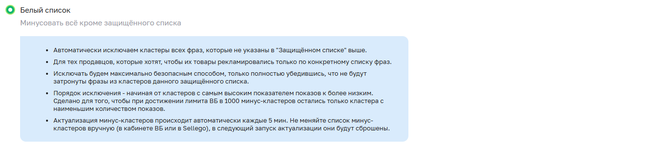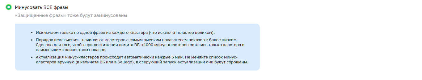 При любом режиме автоминусации важно не менять вручную список фраз на ВБ, так как при следующей актуализации эти изменения будут сброшены.
