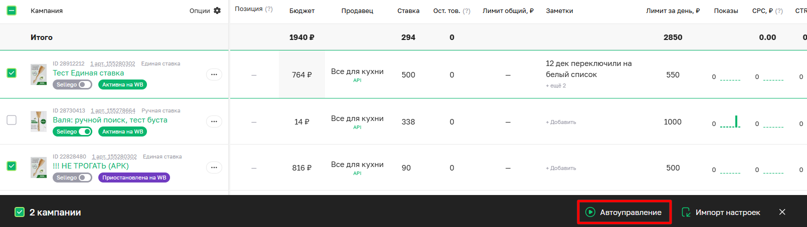 Включить/отключить управление Sellego можно через переключатель, расположенный под названием кампании.