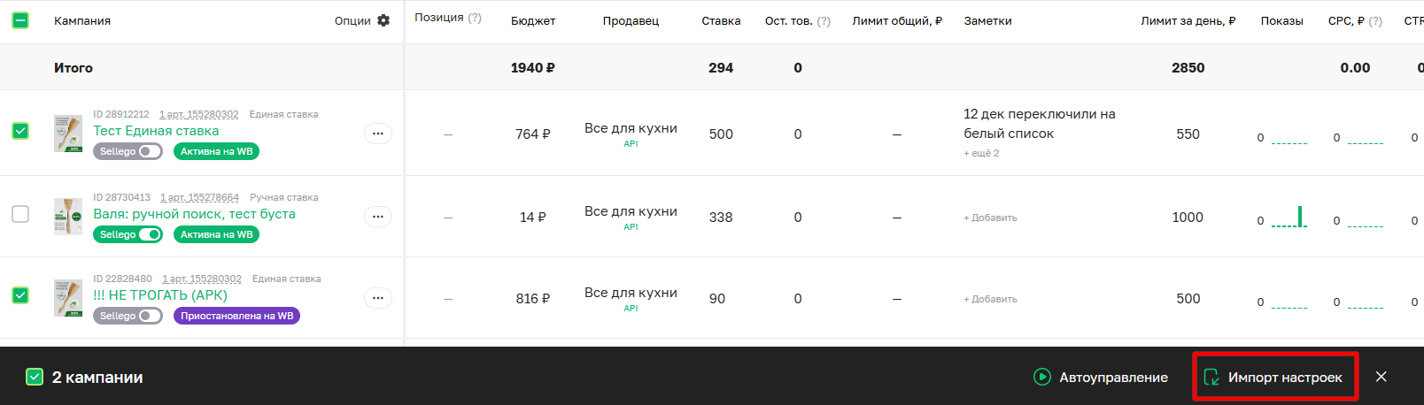 В списке рекламных кампаний выберите несколько нужных кампаний, после чего под выбранными кампаниями появится панель с кнопкой «Импорт настроек».