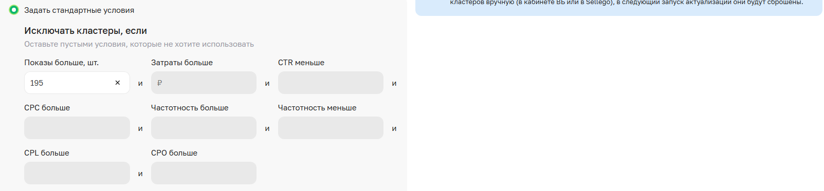 Можете задать стандартную формулу на основе которых будет происходить минусация кластеров. Стандартная формула предполагает исключение кластеров только при полном совпадении всех заданных критериев. Например, кластер исключается, только если одновременно совпадают как показы, так и показатель CTR.