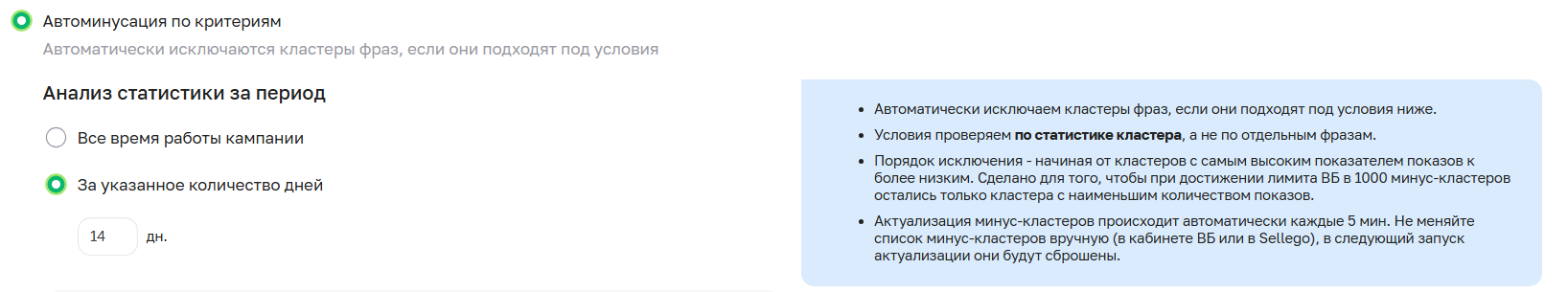 Если выбран период учета статистики за все время работы кампании: если до активации автоминусации какие-либо кластеры были исключены, но теперь их статистика за все время работы кампании не соответствуют критериям исключения, мы вернем их в работу. Они будут исключены снова только в том случае, если подойдут под указанные критерии.