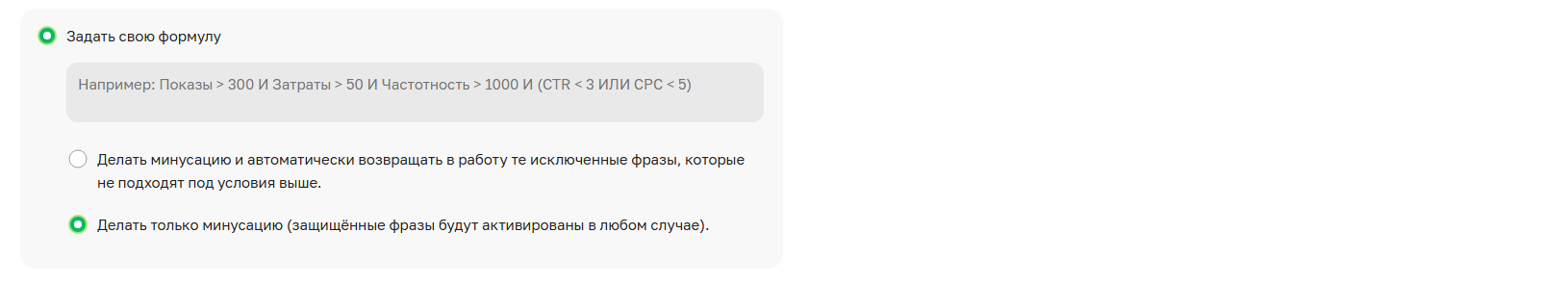 Или можно задать свою формулу, которая может включать как полное, так и частичное совпадение указанных критериев. Например, при исключении учитывать четыре показателя: обязательно показы, затраты и частотность, а четвертый показатель на выбор — CTR или CPC.