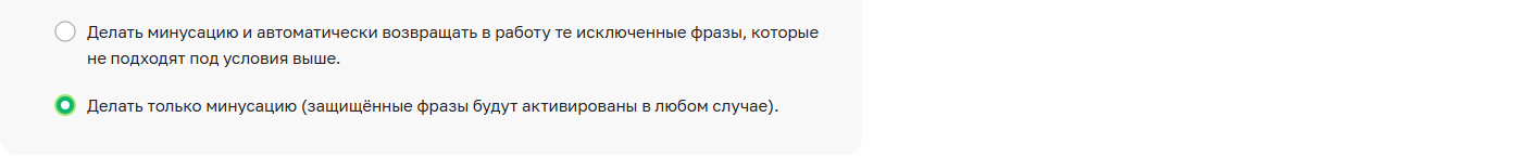 При данном режиме все кластеры, включая фразы из списка Защищенных, будут исключены. Режим предназначен для остановки показов в поисковой выдаче и доступен только в кампании Единая ставка.