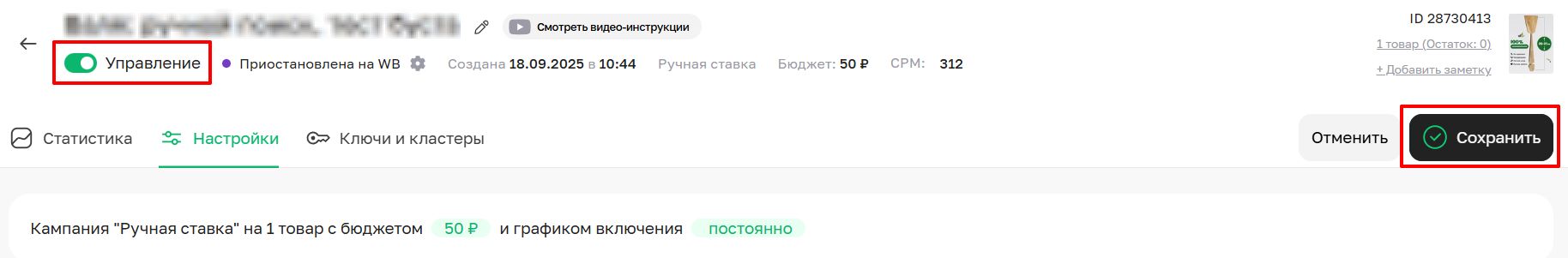 После того как настройка кампании будет выполнена, нажмите кнопку Сохранить и включите Управление Селлего.