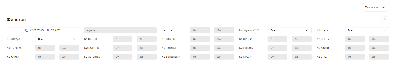 Дополнительные фильтры дают возможность отсортировать фразы по их статусам и статистическим метрикам в той или иной кампании, а также последовательно показать ключи сначала из первой кампании, а потом из второй. Полученные результаты можно скачать файлом, нажав на кнопку «Экспорт».