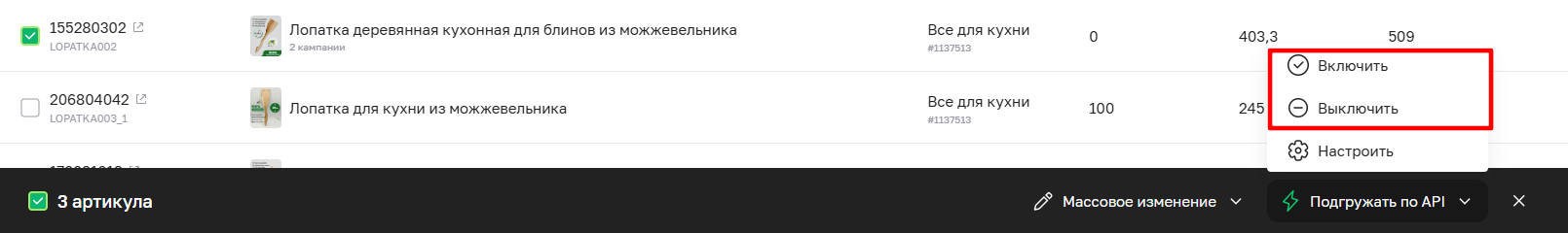 Кнопка «Массовое изменение» позволяет одновременно обновить значения конкретных показателей для всех выбранных артикулов. В открывшемся меню выберите нужный параметр, введите новое значение и подтвердите действие — изменения применятся ко всем выбранным артикулам.