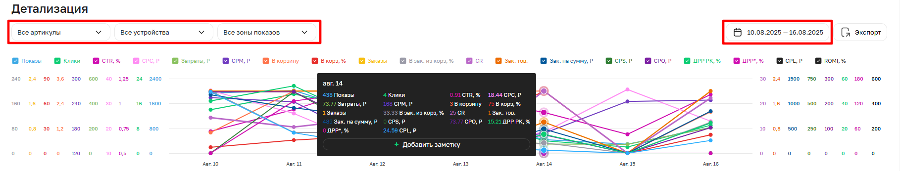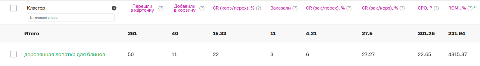 Для расчета CPS (стоимости покупки), ДРР* (доли рекламных расходов) и ROMI (окупаемости рекламы) необходимо добавить дополнительные метрики из вашего кабинета ВБ.