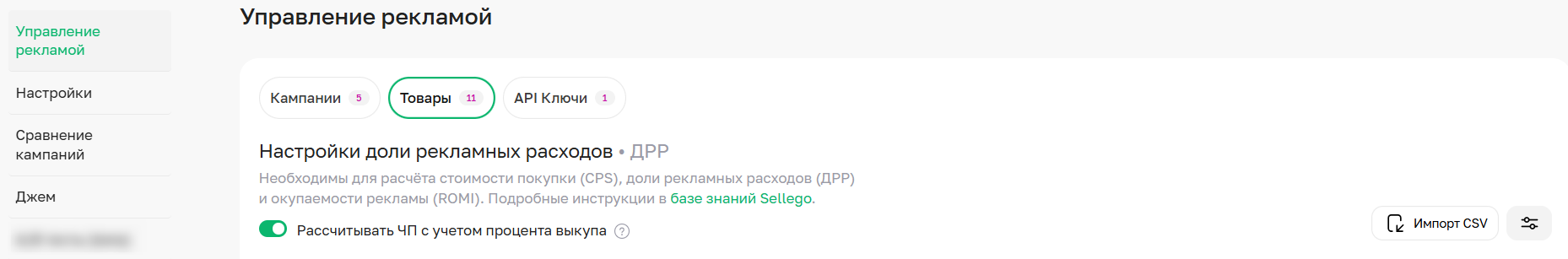 Чтобы вычислить CPS и ROMI, на странице Настроек ДРР необходимо указать процент выкупа и чистую прибыль за единицу товара. Если внесенная ЧП будет включать в себя процент выкупа, активируйте функцию «Рассчитывать ЧП с учетом процента выкупа», чтобы этот показатель не учитывался в формуле повторно.