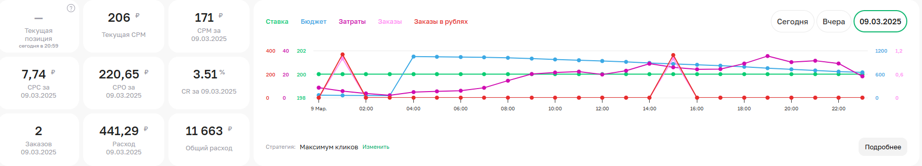 В верхней части страницы находятся общие показатели рекламной кампании. Справа от метрик статистики расположен график, показывающий часовые изменения ставки, бюджета, затрат, заказанных товаров и заказов в рублях. По умолчанию отображаются данные за текущий день, изменить дату можно с помощью календаря.