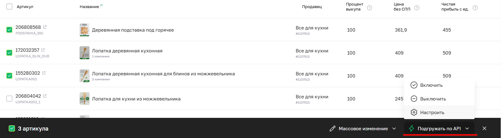 Чтобы включить автоподгрузку процента выкупа и цены товара без СПП выделите нужные товары с помощью чек-бокса и нажмите кнопку “Данные через API - Настроить” на появившейся панели внизу страницы.