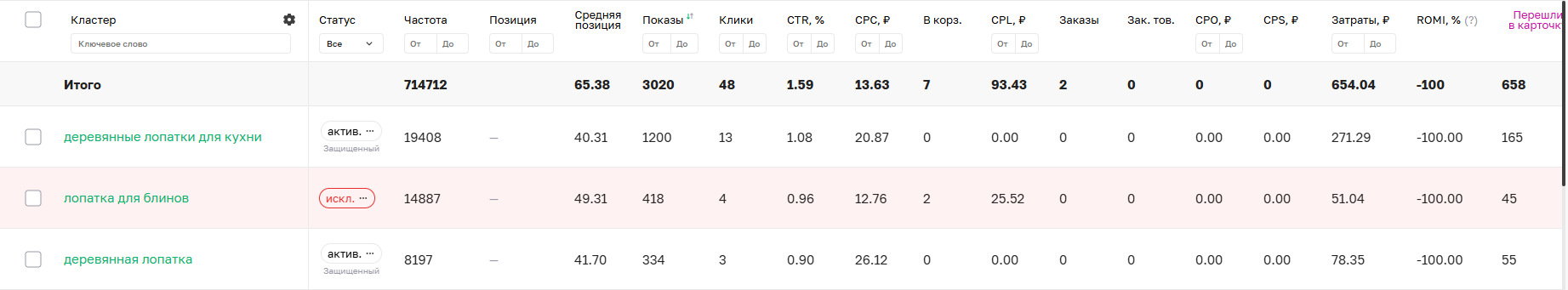 В таблице будут отображаться кластеры. Чтобы увидеть входящие в кластер фразы кликните на его наименование.