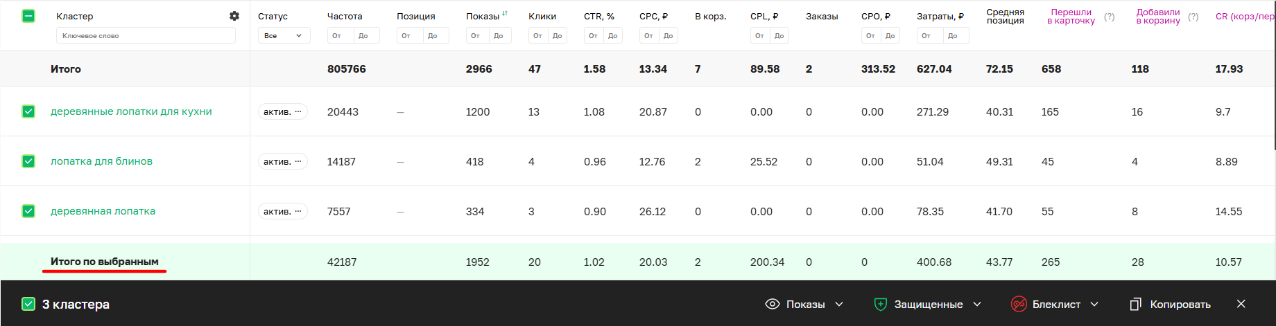 В кампании "Единая ставка" по каждому кластеру отображены: