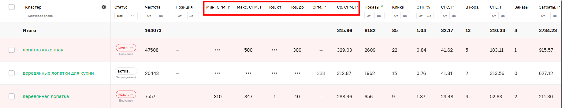 В кампании "Ручная ставка" кроме выше перечисленных метрик присутствует еще усредненная ставка по кластерам. Также предусмотрено автоматическое управление индивидуальными ставками кластеров. За подробностями обращайтесь к отдельной инструкции.